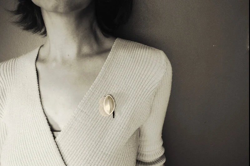 This brooch is made from Argentium silver as well as re-used HDPE plastic. The silver shape is textured and press-formed to achieve the beautifully rounded shape.